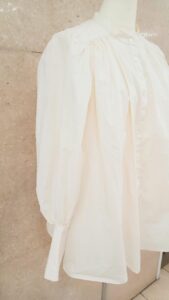 袖の二の腕部分にシャーリング(ゴム)を入れることで、ストンとした袖がふんわりと丸みのある立体的なシルエットに生まれ変わります。