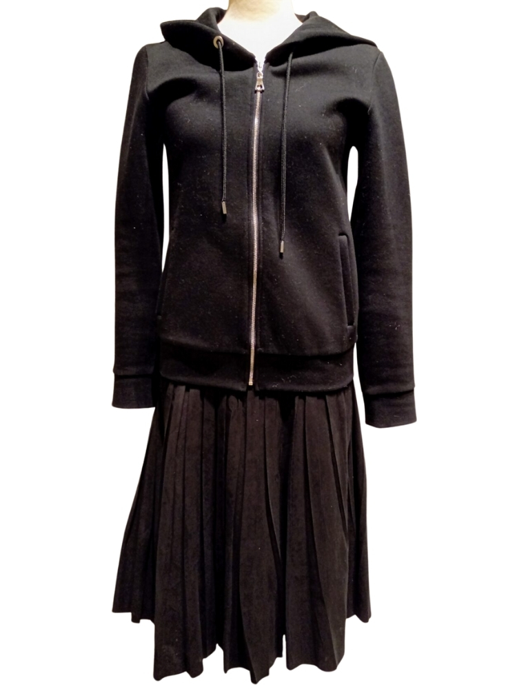 トップス部分にはパーカーのカジュアルな快適さ、スカート部分には元のスカートのフェミニンな雰囲気がそのまま生かされています。このリメイクの最大の魅力は、コーディネートを考えなくても、これ一枚でおしゃれが完成すること。